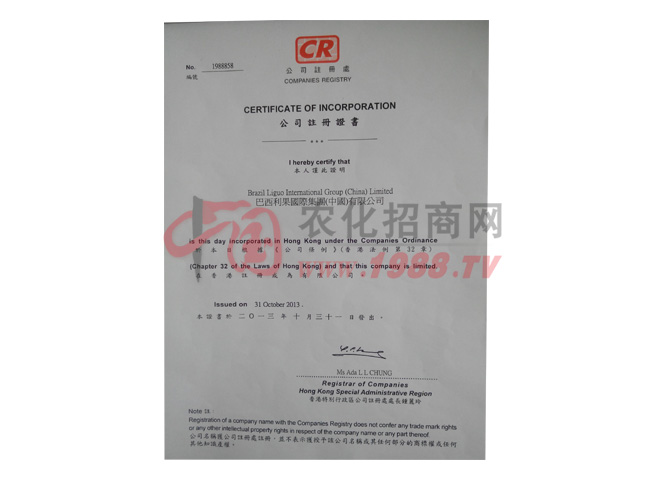 證書(shū)名稱(chēng):公司注冊(cè)證書(shū) 發(fā)證機(jī)構(gòu):香港特別行政區(qū)公司注冊(cè)處